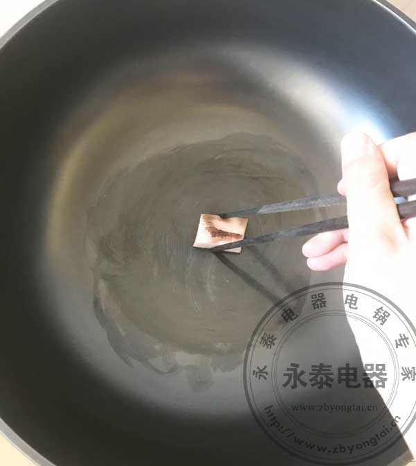 下邊我們開(kāi)始使用一下,看看好不好用。鐵鍋第一次使用要先開(kāi)鍋,準(zhǔn)備一塊肥豬肉,用筷子夾住生肥豬肉,以螺旋狀在鍋內(nèi)壁不停地擦拭,油脂均勻地涂滿整個(gè)鍋面。重復(fù)幾次,大概十幾分鐘即可。